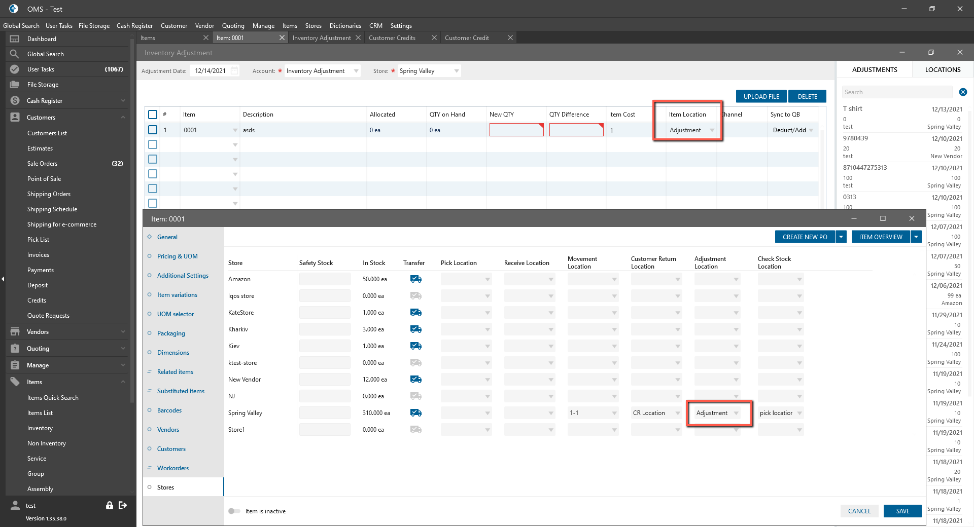- On the Inventory Adjustment for the corresponding Store is displayed default location;
