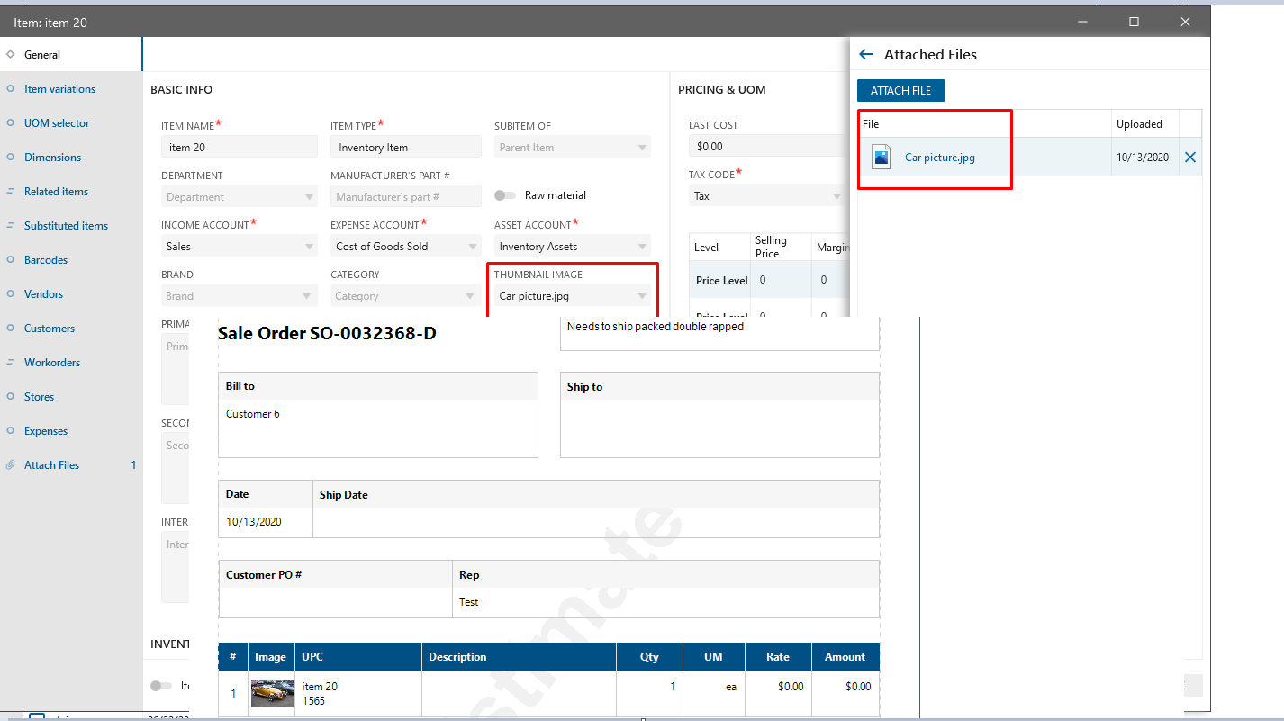 To see jpg image on the Customer flow pdf, attach jpg file on the Item edit form, then select the attached file in Thumbnail Image field. If more than one images were added then Thumbnail Image field will be prefilled with the first image in the list. Create SO, click on the Print Icon