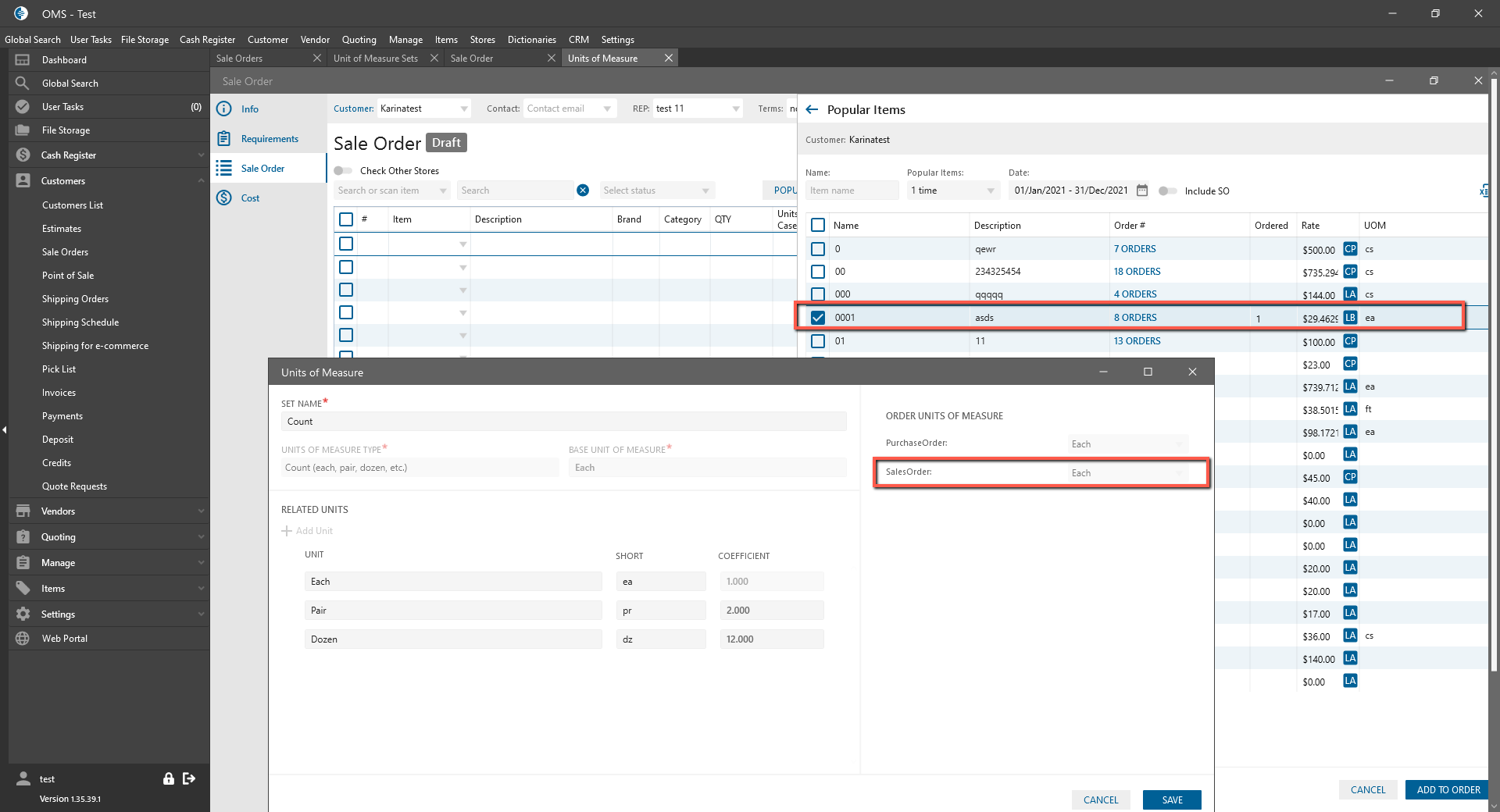 - Create Sale Order with UOM item -> Select Customer In the item edit form -> For item is selected Count Unit of Measure Set;