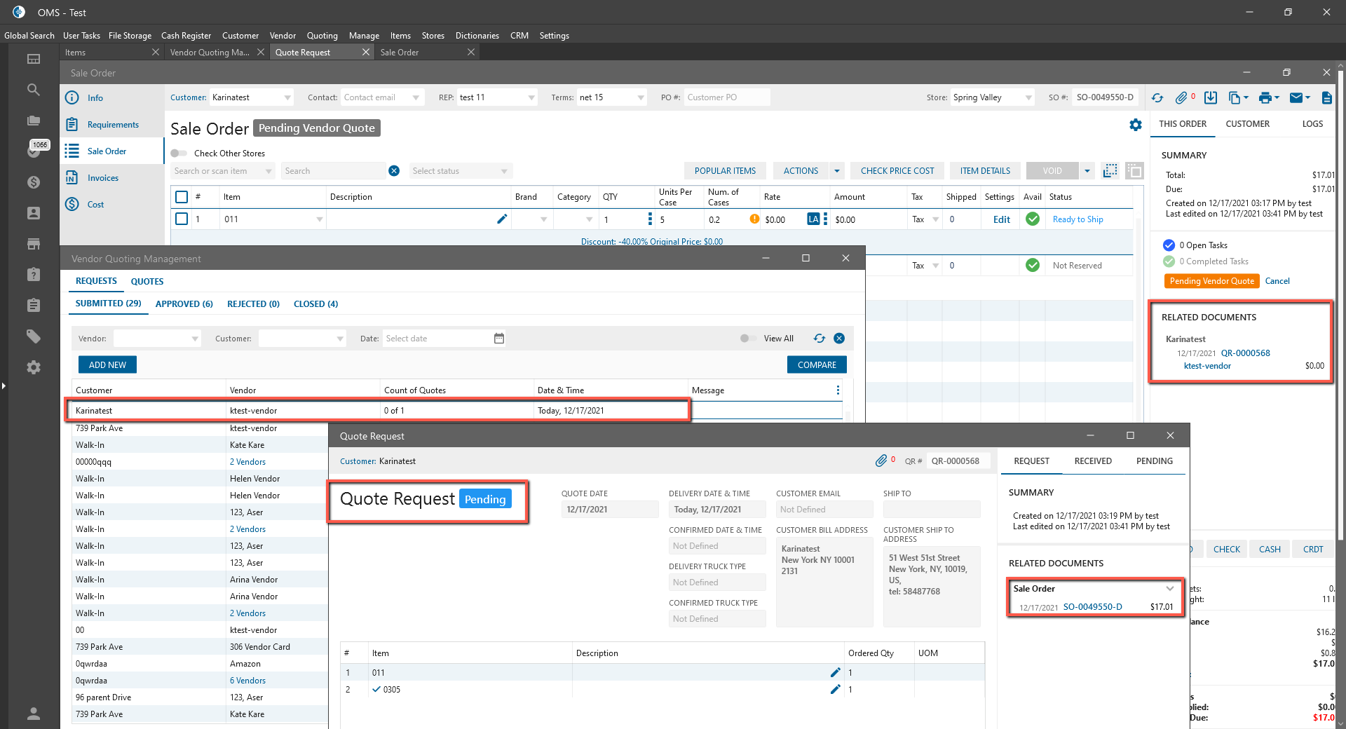 - Quote Request is displayed in the Vendor Quoting Management Requests List and linked to SO.