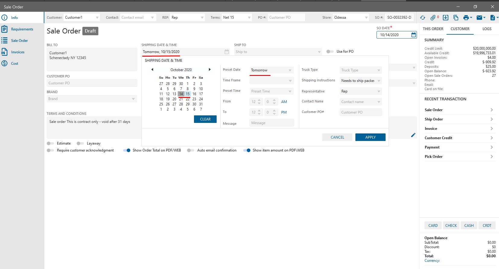 To find the date and time fixes on SO edit form go to Customers module -> Sale Orders -> Sale Order edit form -> Info. Set Tomorrow date.