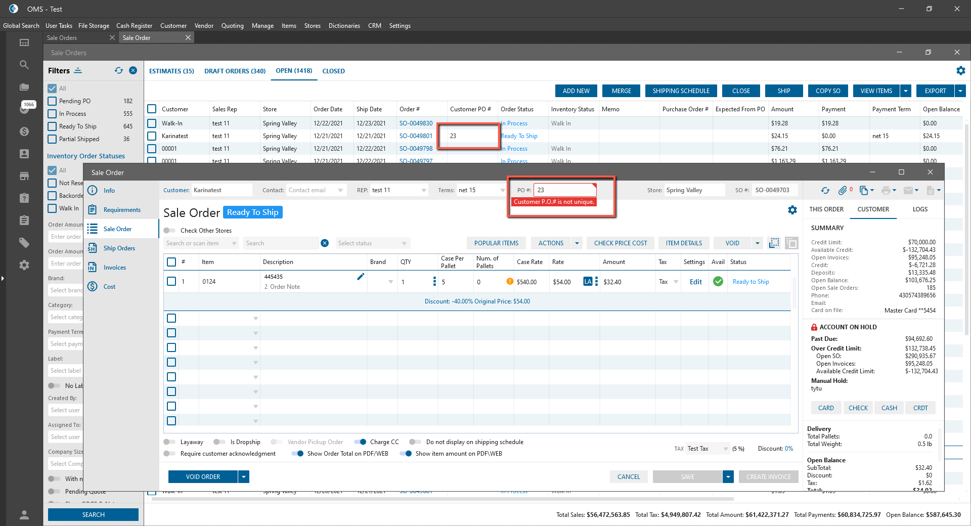 - On the Sale Order edit form -> If the user filled not unique Customer PO for the same Customers -> “Customer P.O.# is not unique” validation message is displayed.
