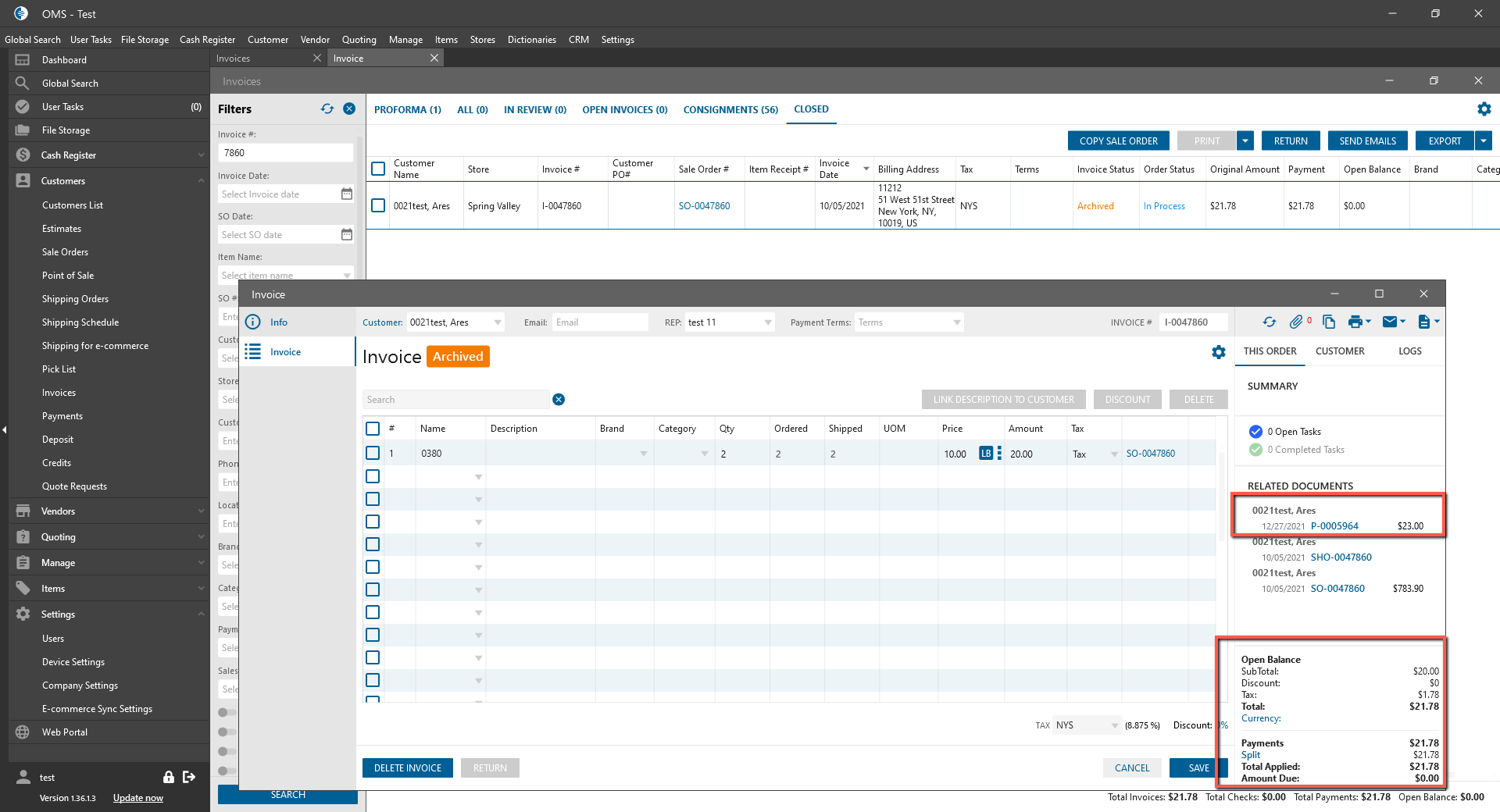 - This Invoice is in “Archived” status and is displayed on the closed tab.