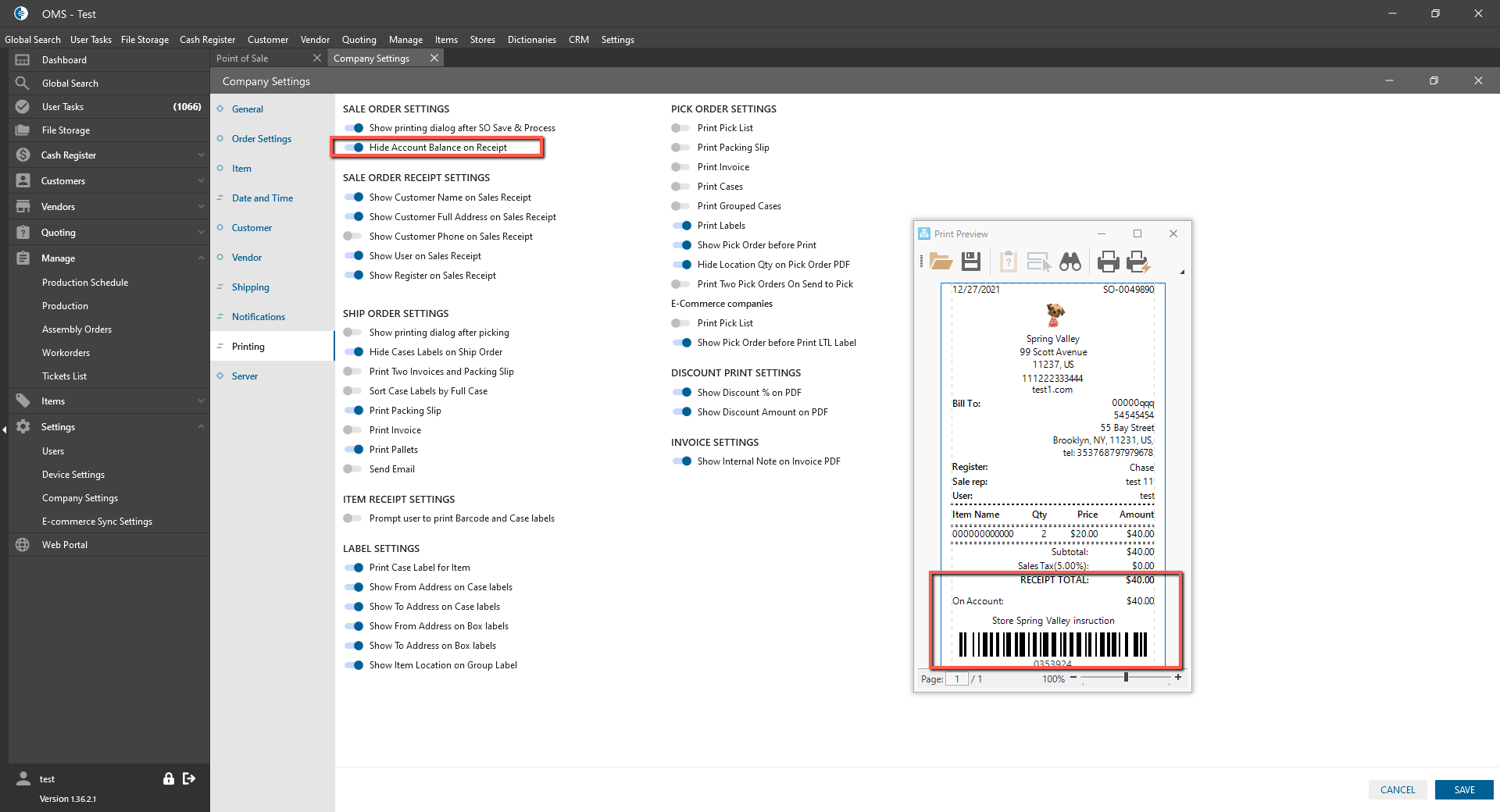 - On the Point of Sale -> On the Sales Order Receipt, Prev/New Account Balances are hidden.