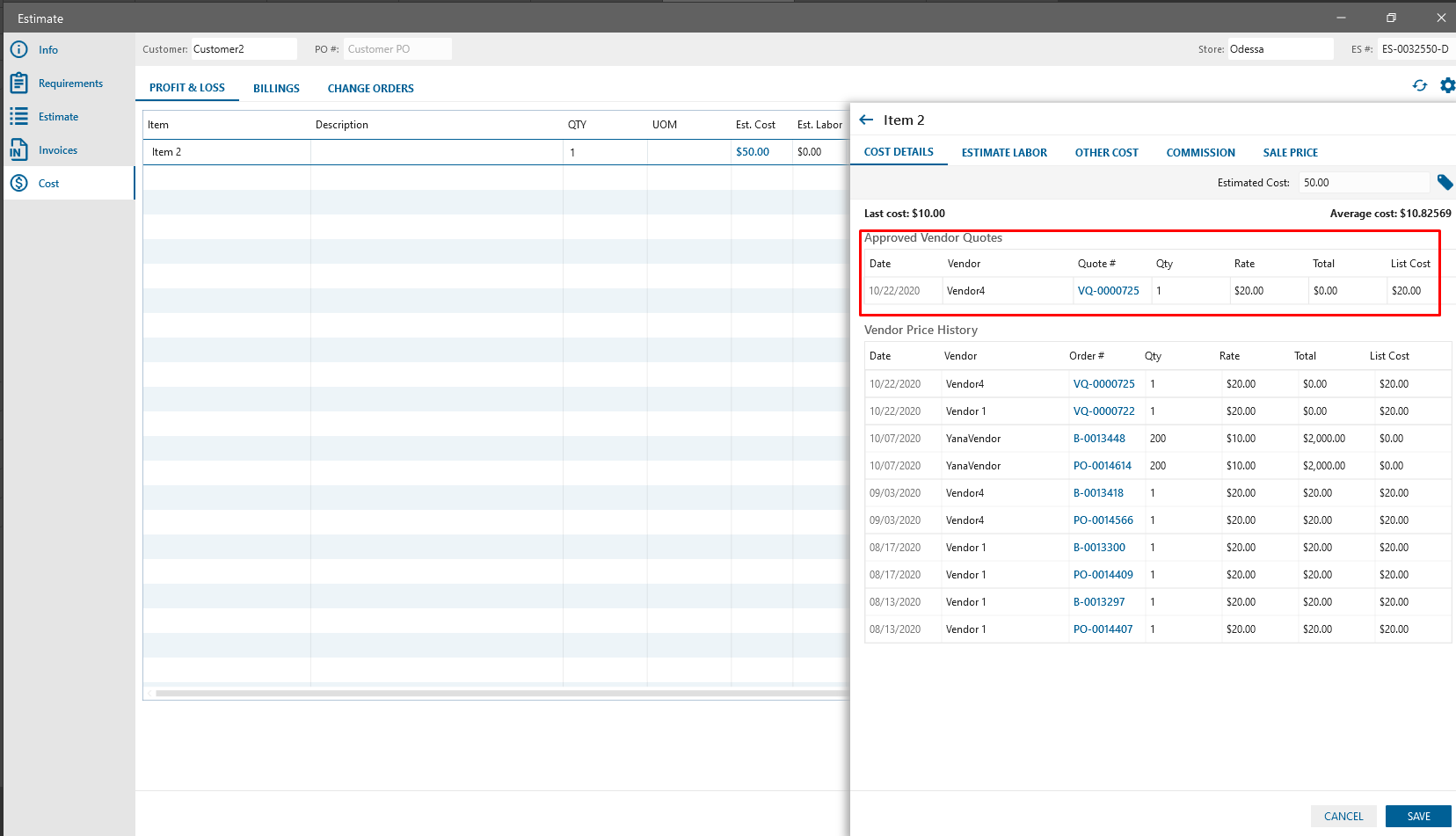 To see Approved Vendor Quotes with approval date, Vendor, Qty, Rate, Total, List Cost go to SO/Estimate edit form -> Cost tab -> Cost Details