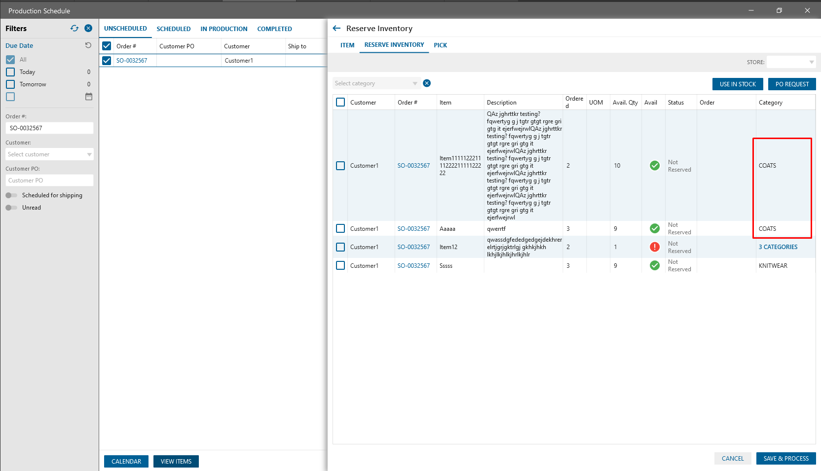 To check Inventory grouping and sorting on the Reserve inventory form go to Production Schedule form -> click “View Items” button. On the “Reserve inventory” form, Inventory are Grouped by Item & Sorted By Category.
