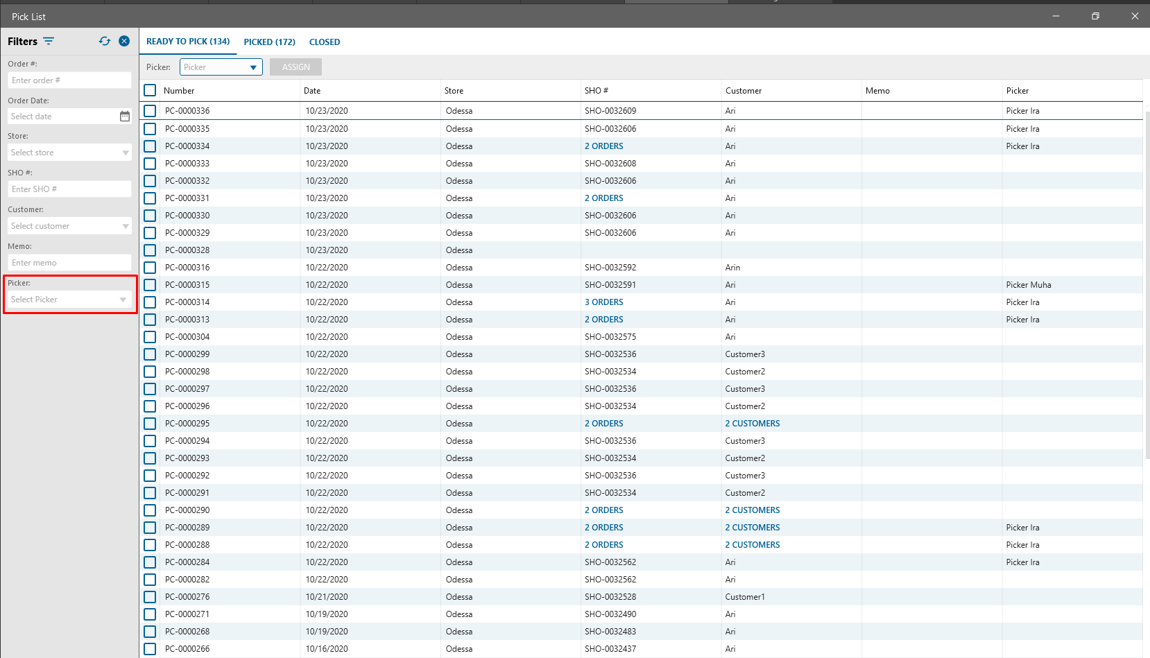 On the Pick list form has been added the ability to filter data by specified in Pick Orders Picker