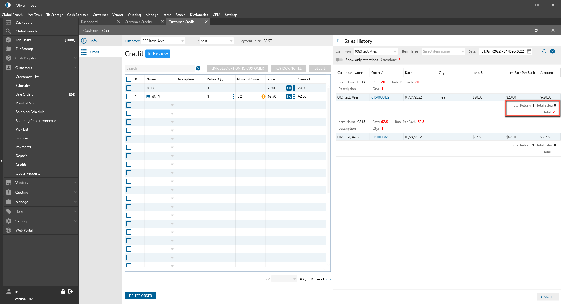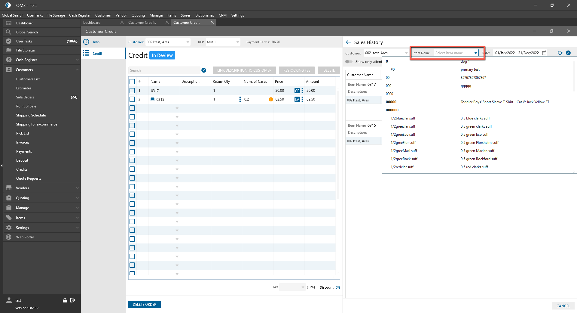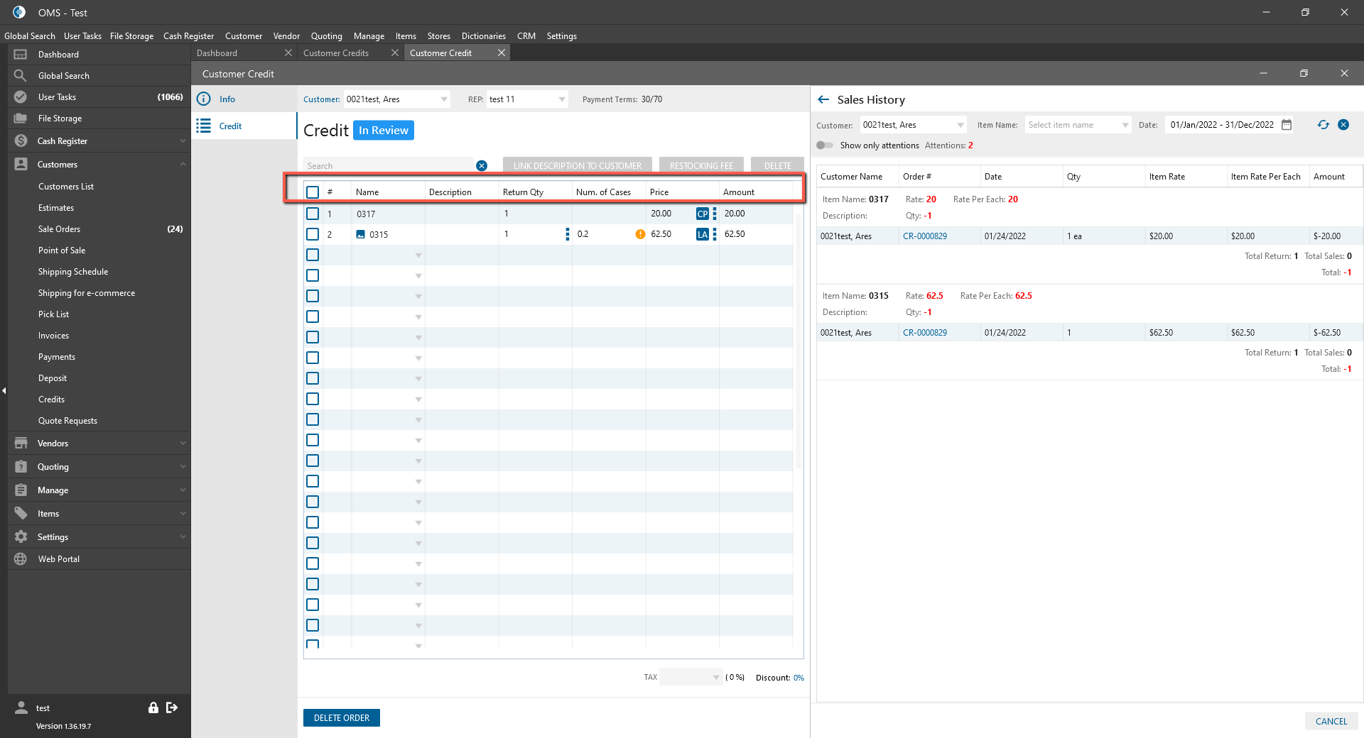 - Customer Credit form is displayed as slider -> while Sales History panel is opened: