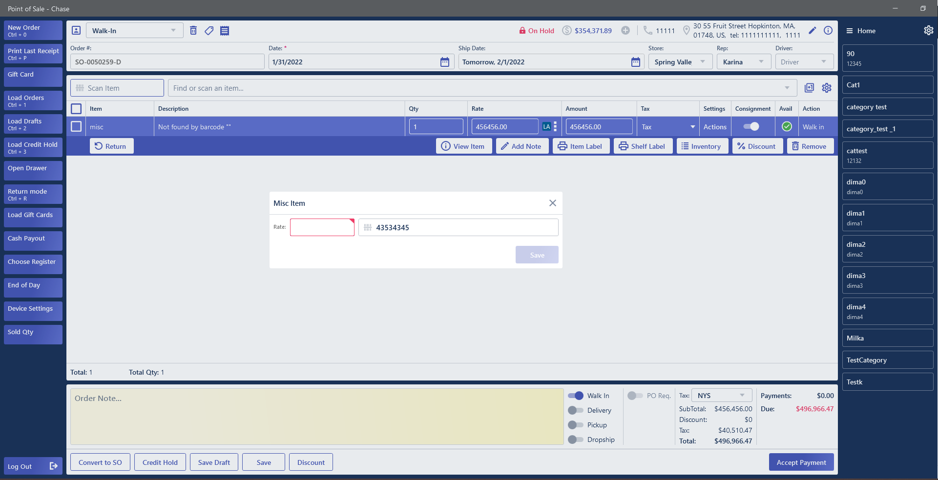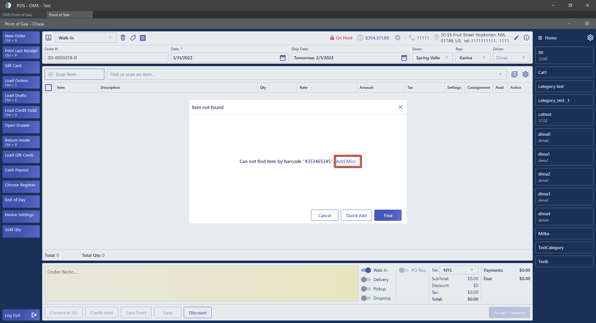 - “Item not found” message is displayed -> next to message is displayed -> “Add Misc” button:
