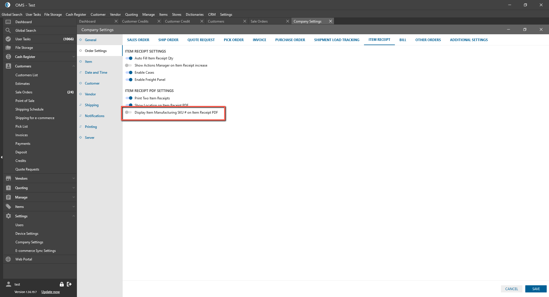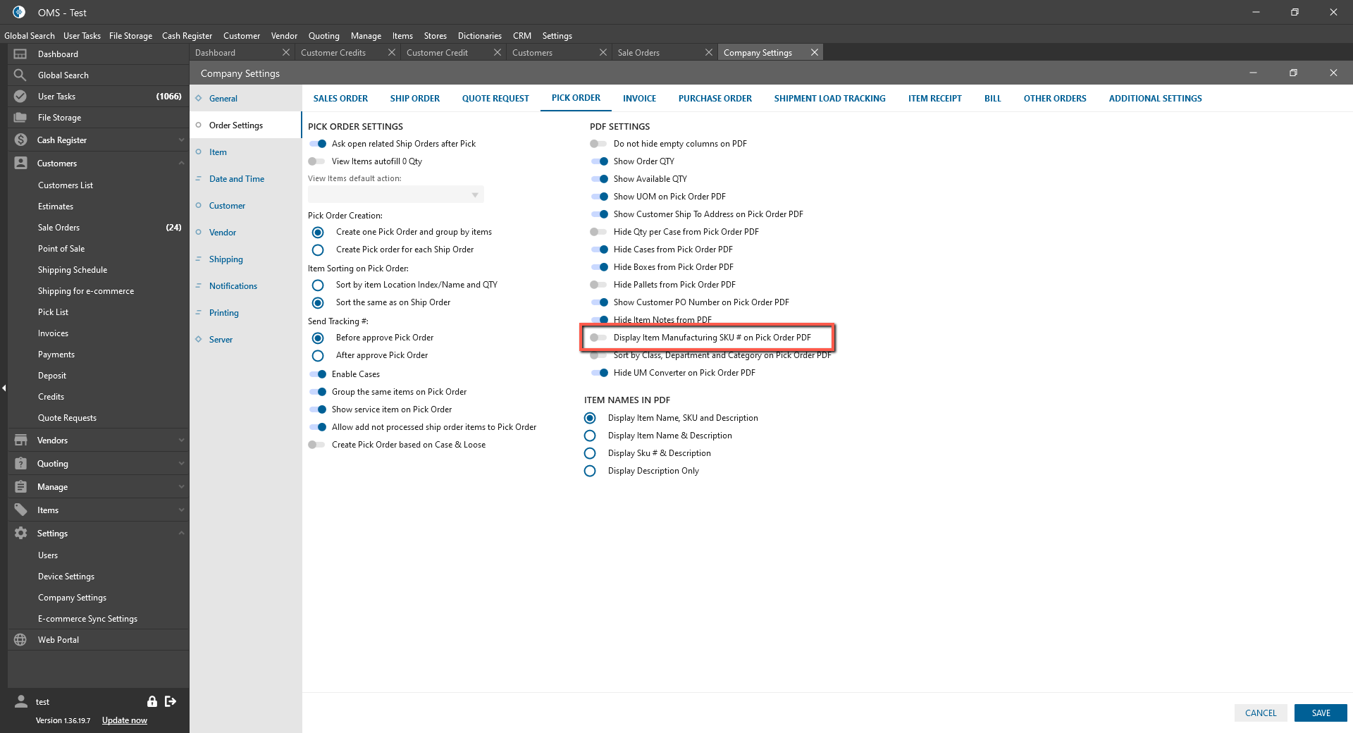 - “Display Item Manufacturing SKU# on Pick Order PDF” checkbox: