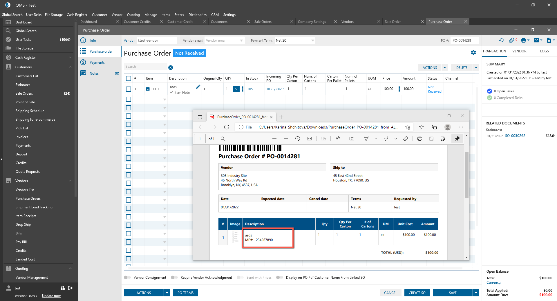 - For Purchase Order was selected Vendor with item Manufacturing SKU#;