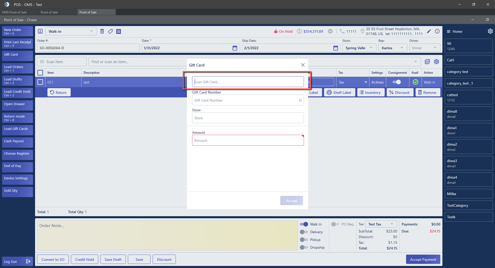 “Gift Card” pop-up is opened with focus in the “Scan Gift Card” field.