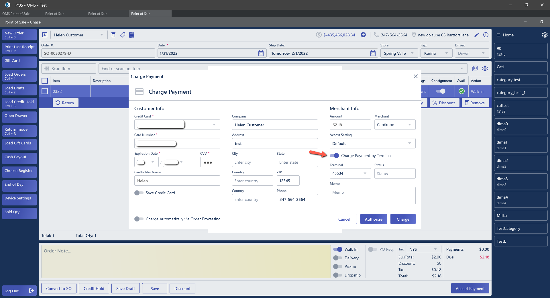 - Select Credit Card Payment method -> Click Accept&Charge;