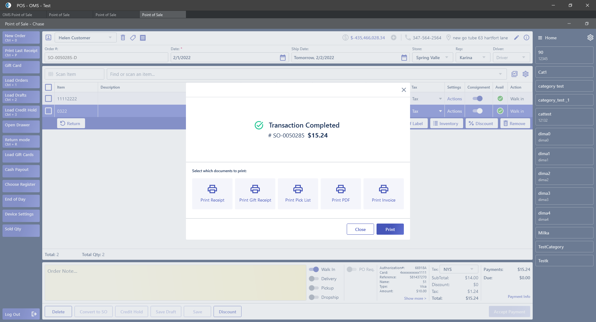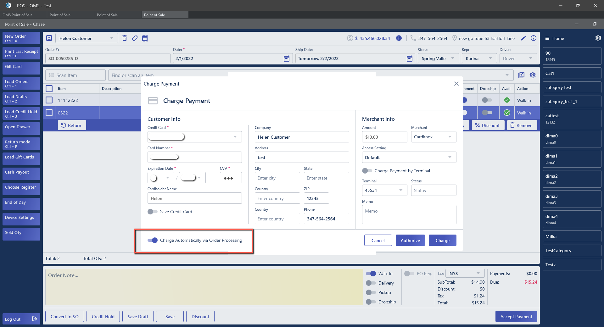 - Reopen Order, add full Payment(Credit Card – “Charge Automatically via Order Processing” checkbox -> checked ON) -> Charge;