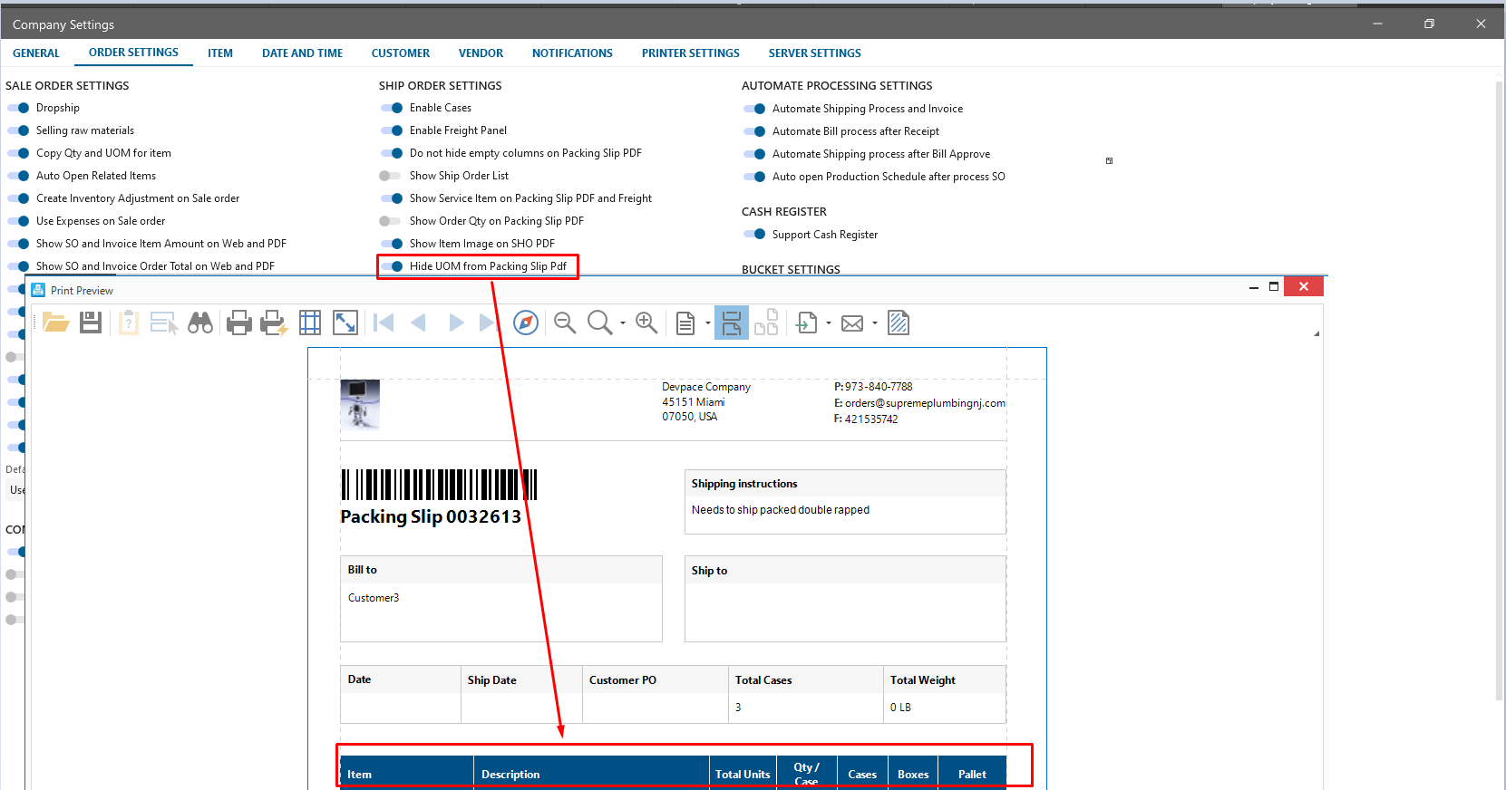 To manage Company Setting for hiding UOM column from Packingslip pdf go to Settings -> Company Settings -> Ship Order Settings section.