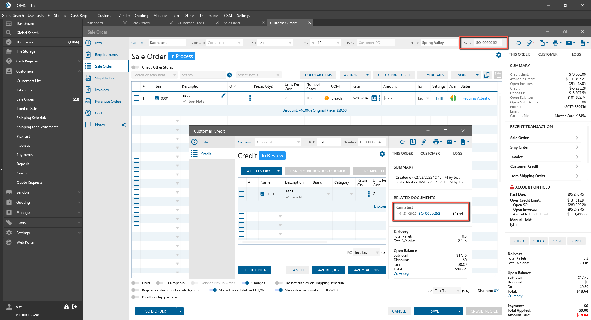- In the Customer Credit “Related Documents” list is disdplayed linked Sale Order.