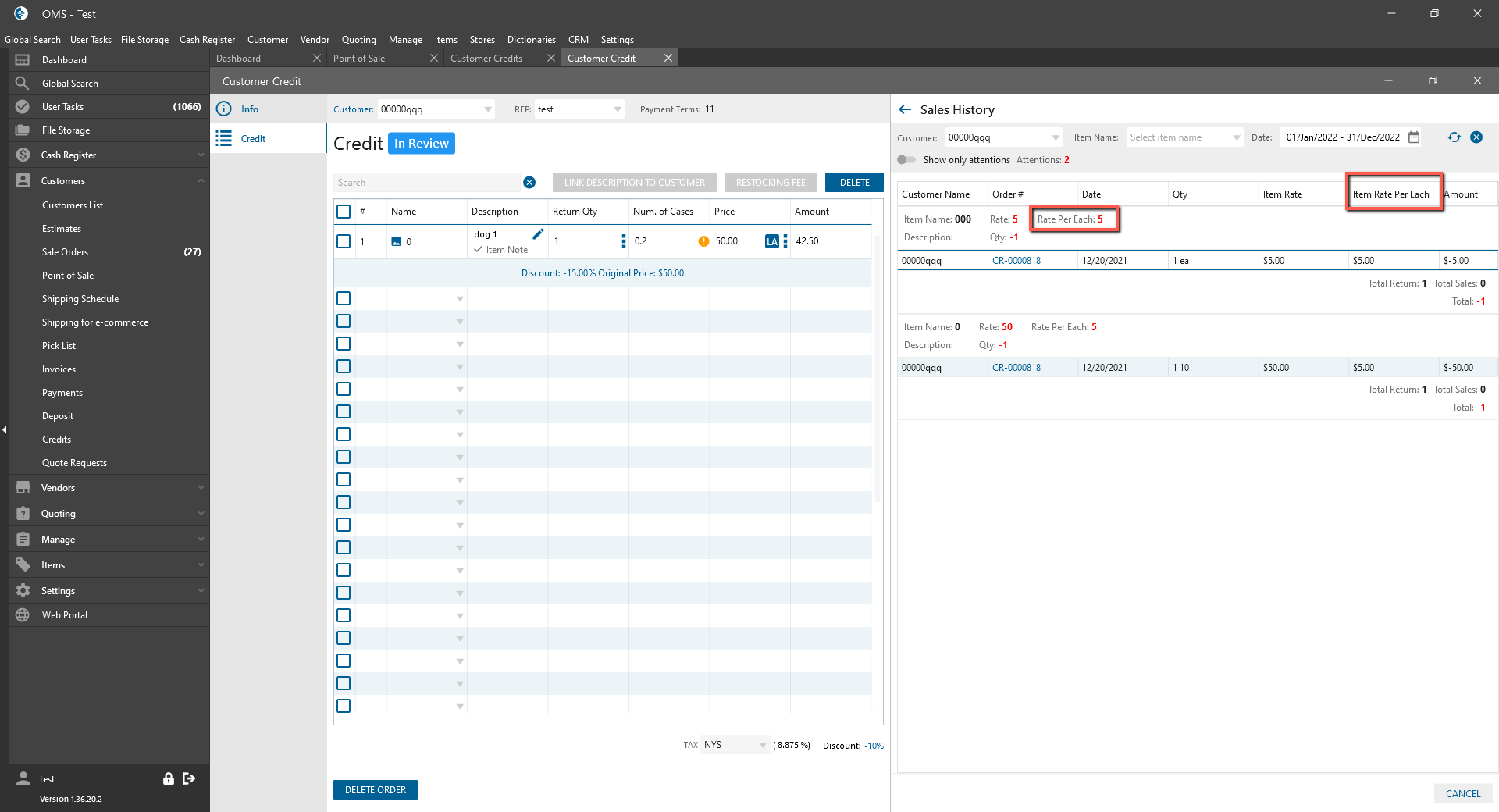 Customer Credit edit form -> Sales History panel: