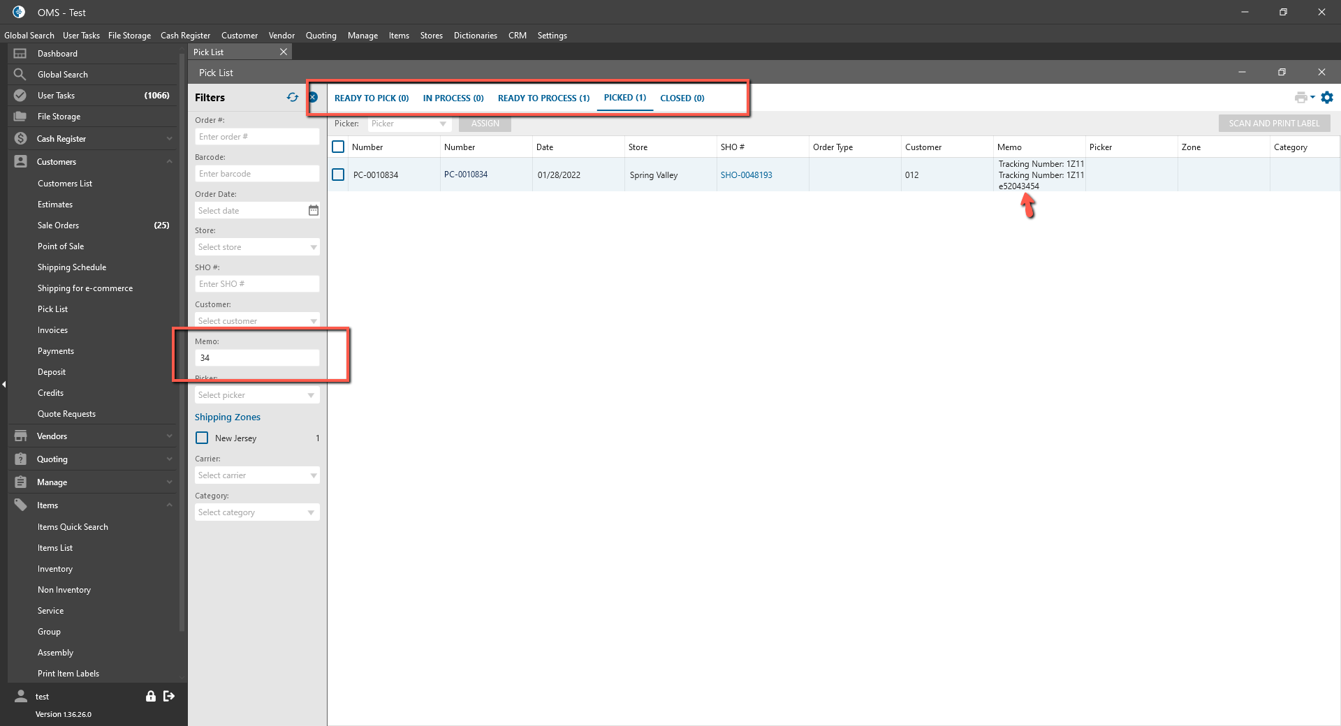 After user filtered Order on the Pick List by “Memo” filter -> the counters of buckets are displayed correct Orders count.