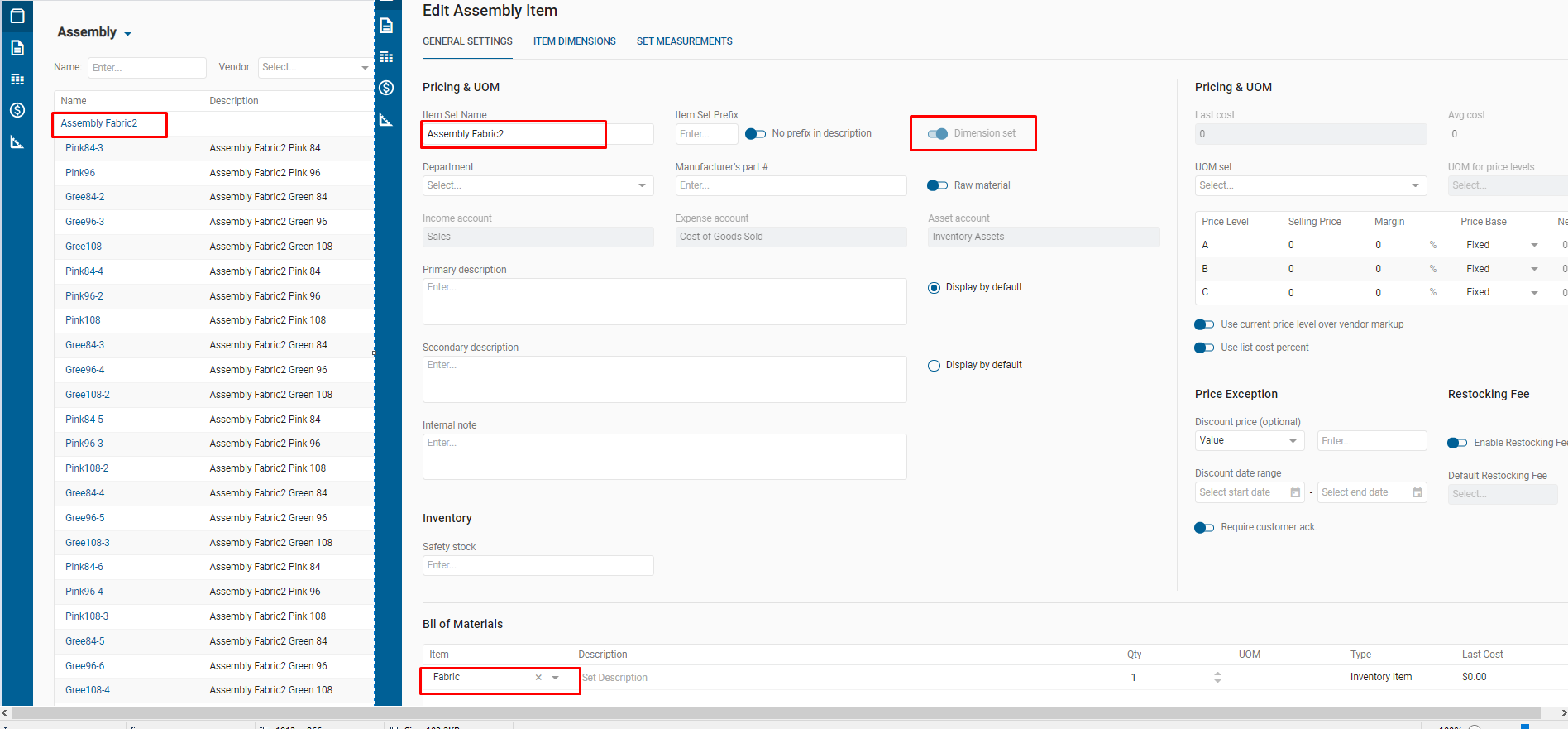 - if Assembly item dimensions = dimensions for the item in BOM Inventory item set -> in newly generated item instead of BOM item set will be proper item from selected item set