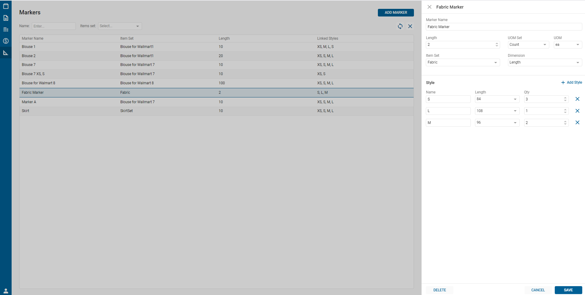 - Marker Panel. User is able to specify the following parameters on the panel: Marker Name, Length, UOM set, set, Item set, Dimension, Style.