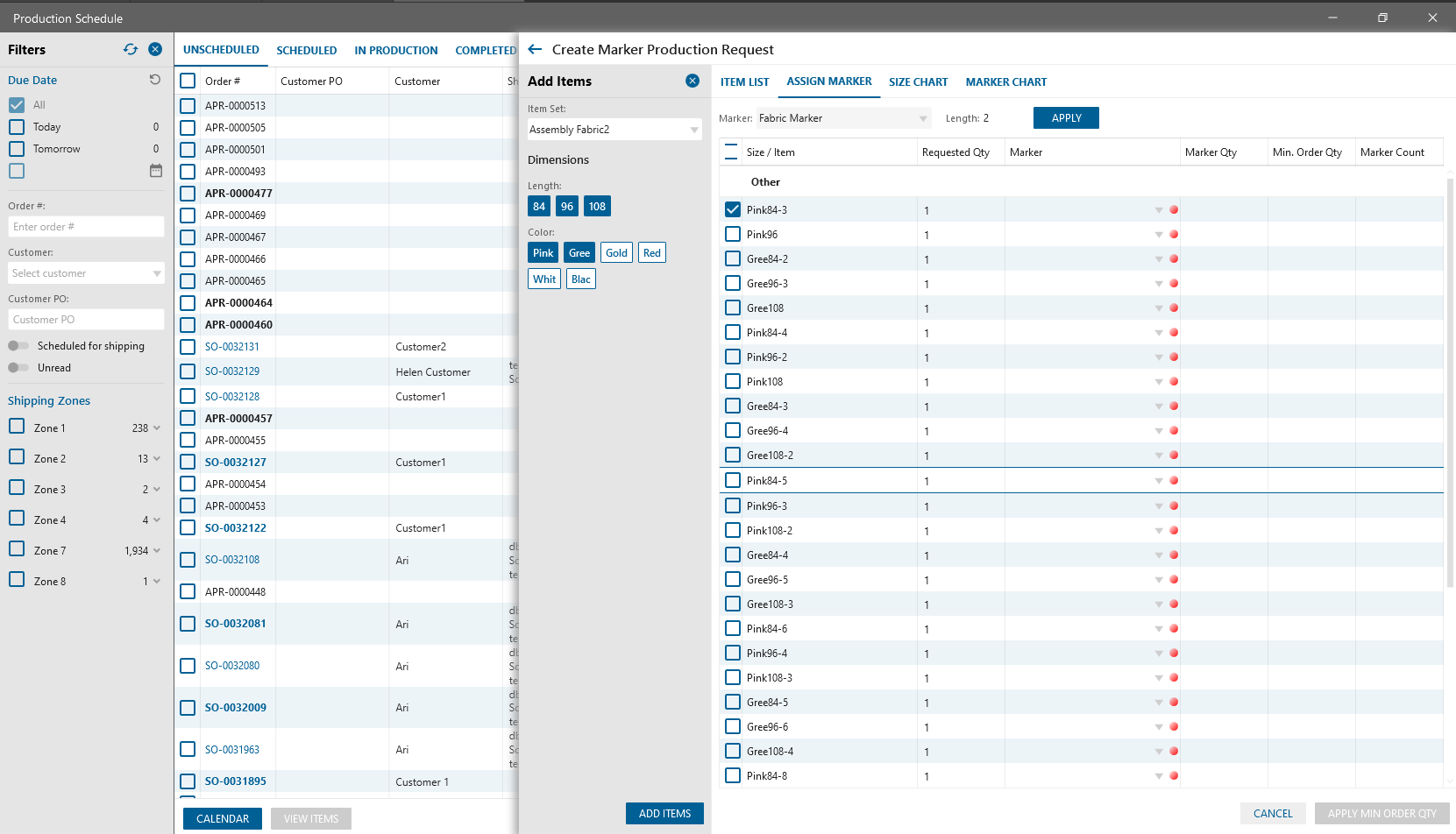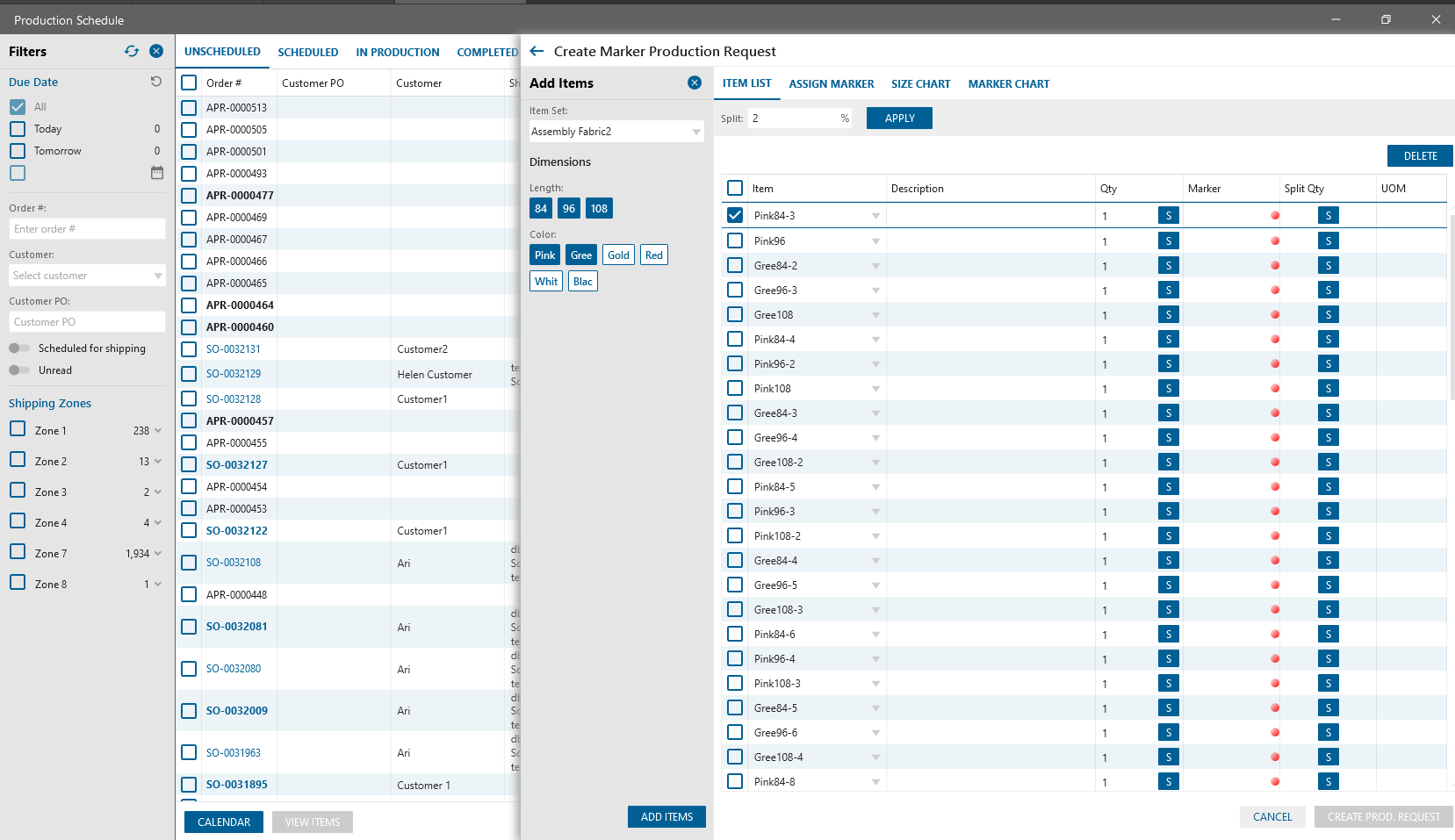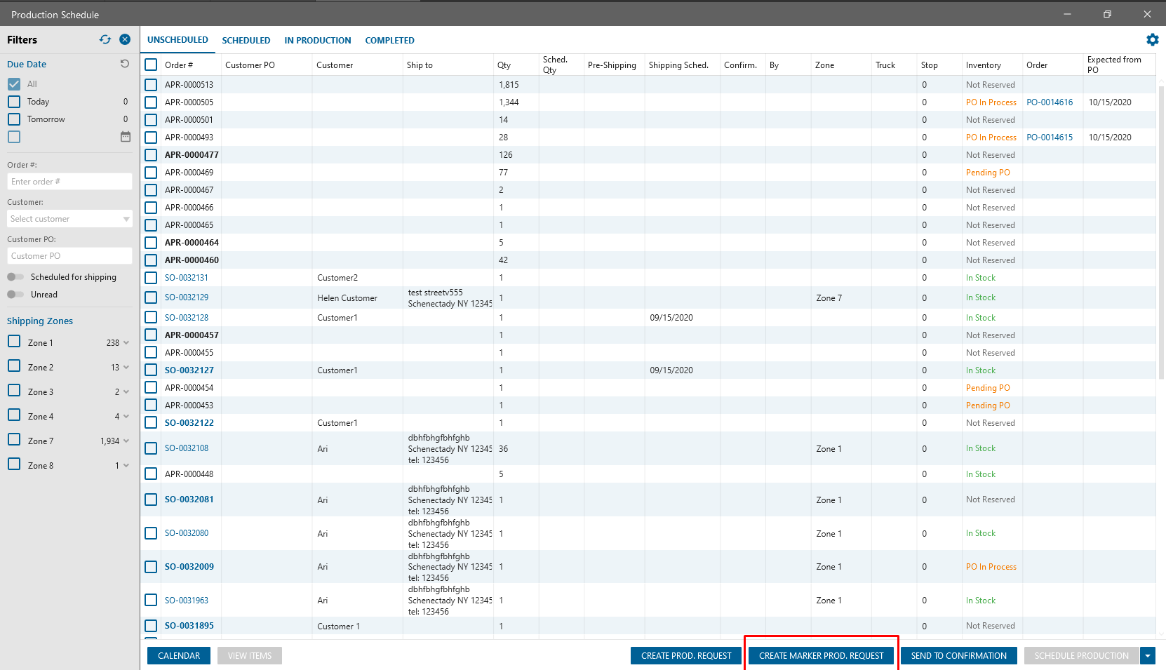 “Create Marker Prod. Request” button is added to the Production Scheduled. After clicking on the button, “Create Marker Production Request” panel will be opened.