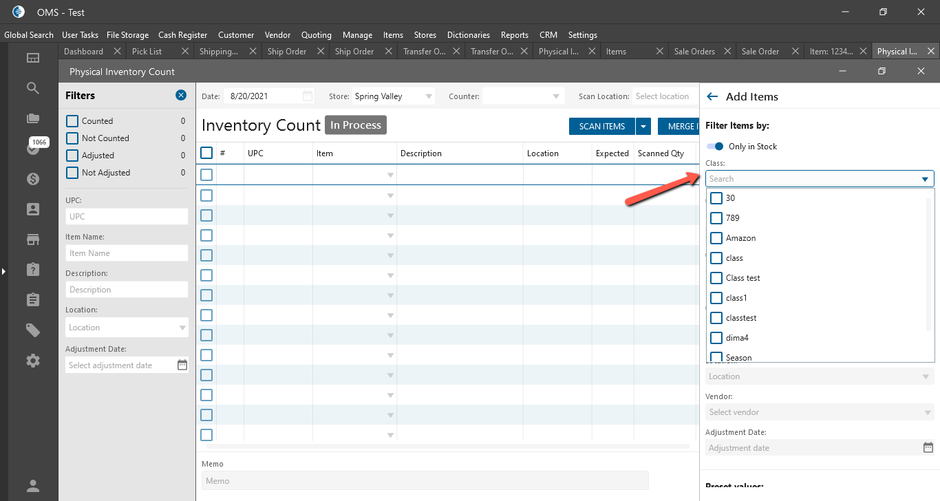 Physical Inventory Count edit form -> Add Items panel:
