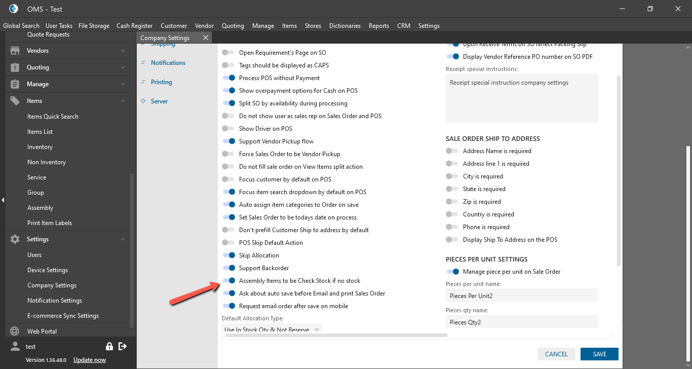 - “Assembly Items to be Check Stock if no stock” checkbox: