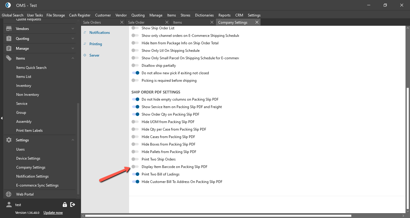- “Display Item Barcode on the Packing Slip PDF” checkbox: