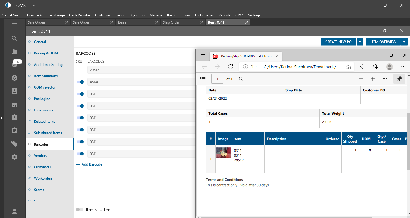 - Item Barcode is displayed on the Packing Slip PDF in the Item Name column;