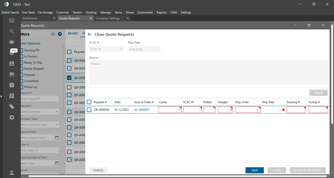- if at least one checkbox is checked -> the corresponding field is required on the “Close Quote Request” panel.