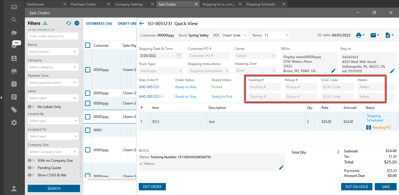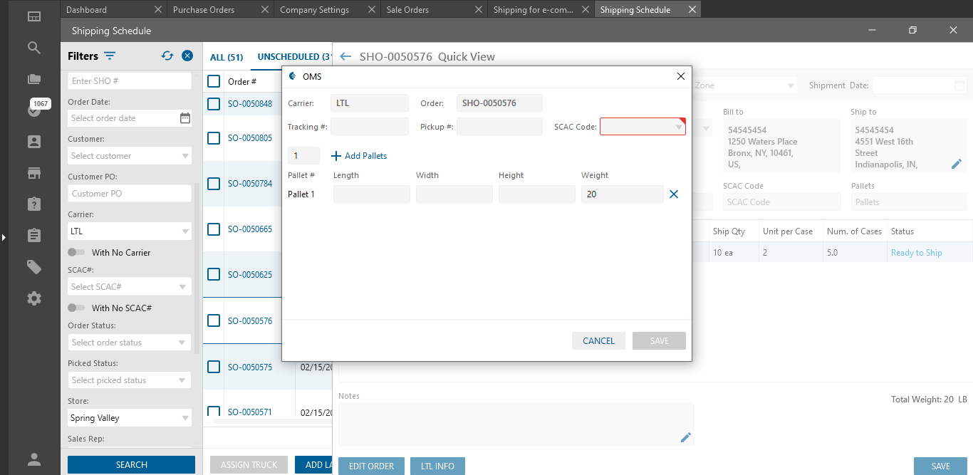 Ship Order Quick View panel -> If the order is for LTL Carrier: