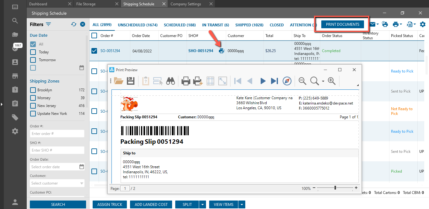 - are printed Packing Slip and Bill of Lading for the checked Order;