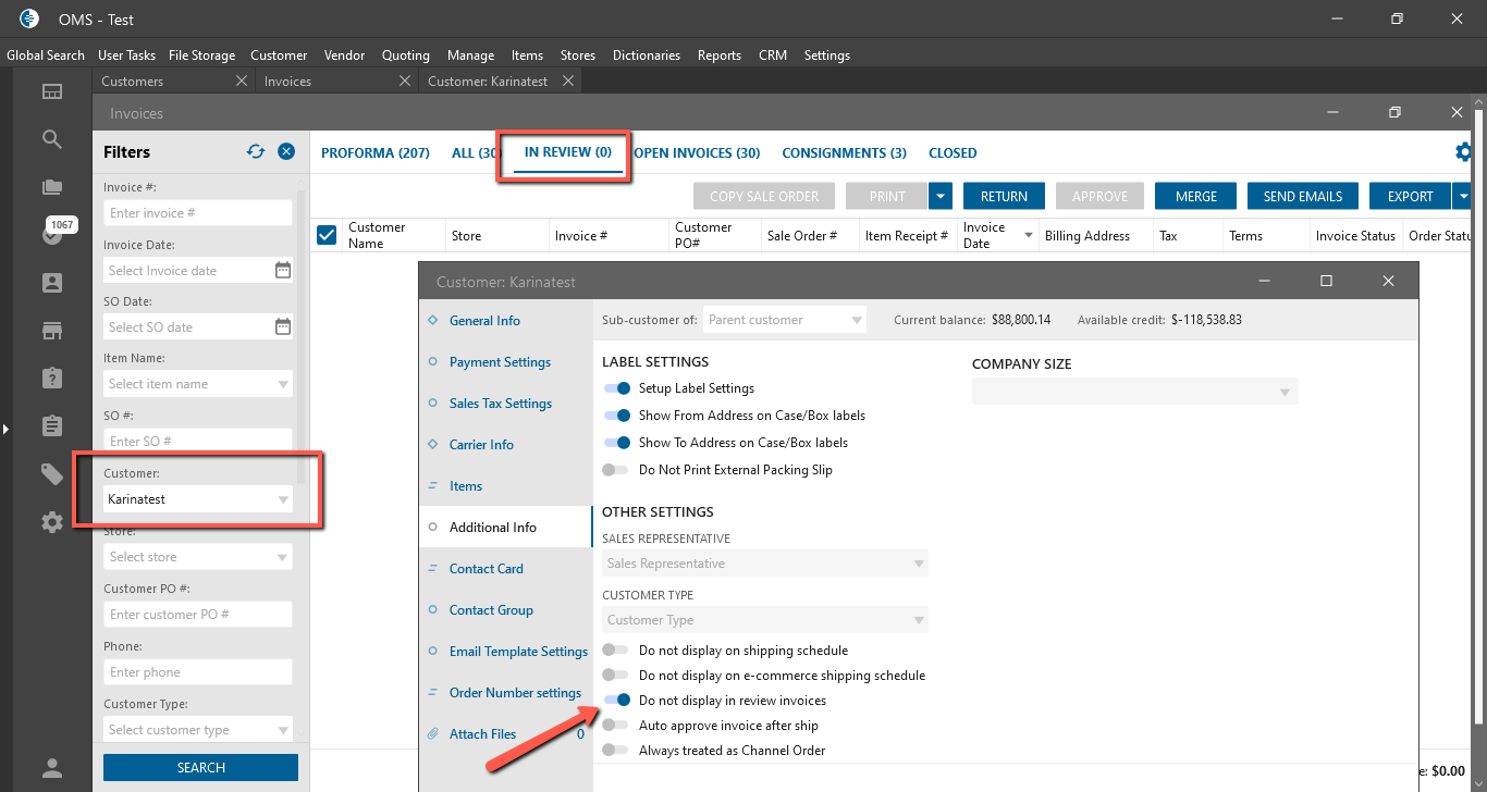 - On the Invoices List form -> “In Review” bucket -> aren’t displayed “In Review” Invoices for the coreesponding Customer.