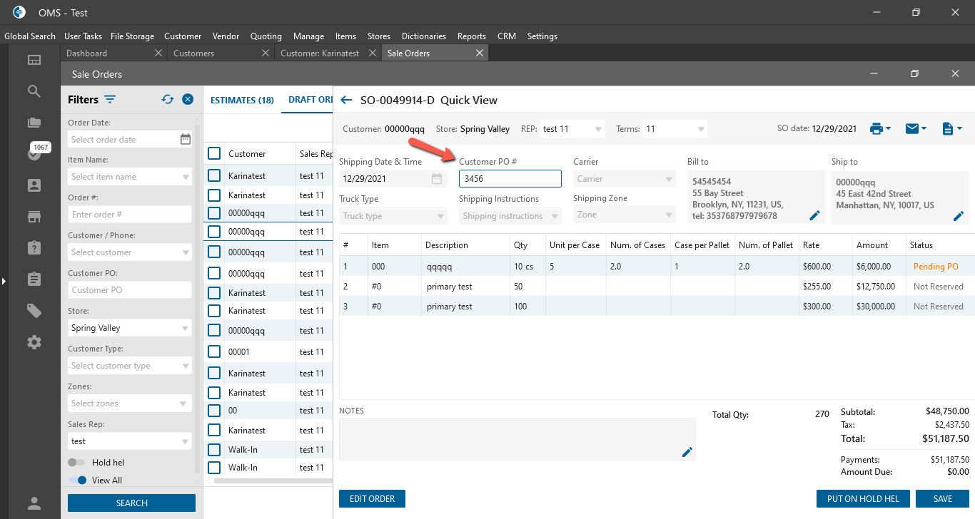 - “Customer PO #” textbox: