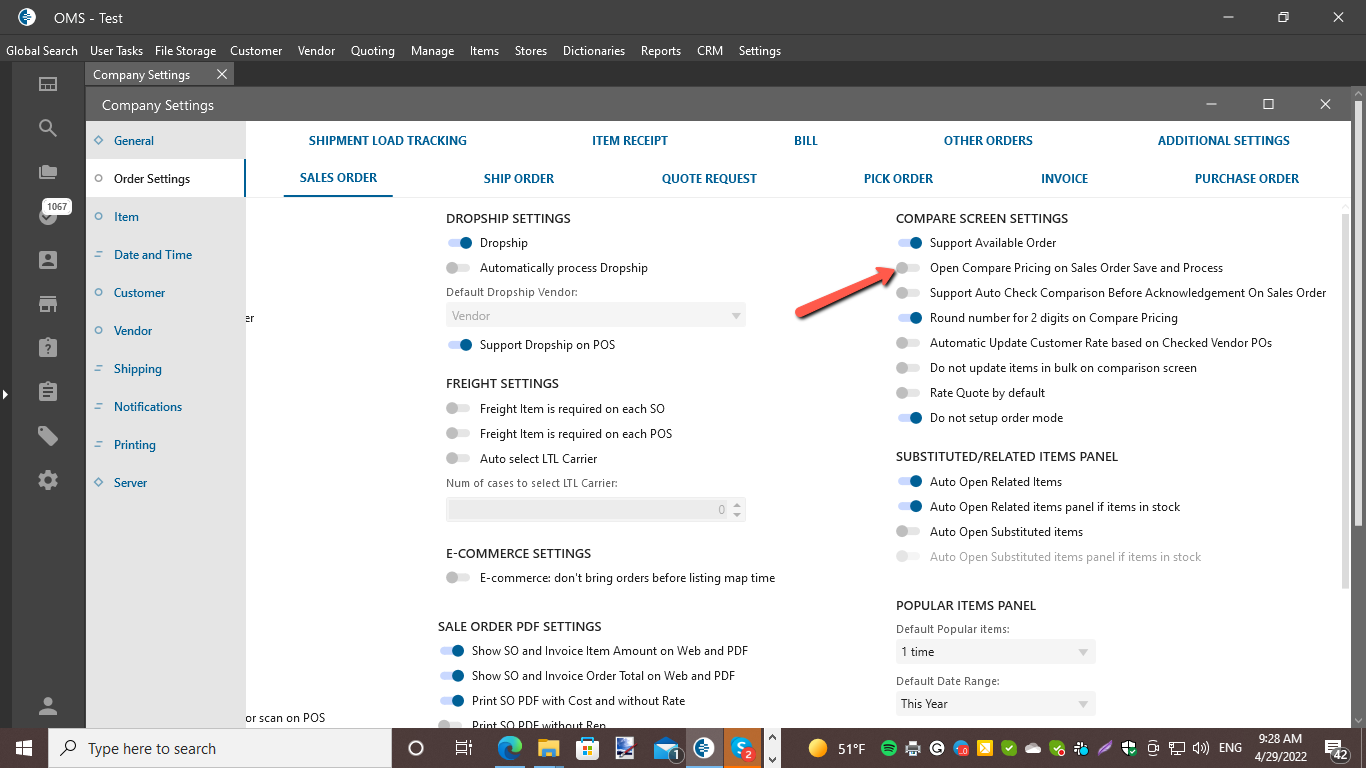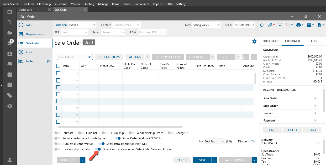 - “Open Compare Pricing on Sales Order Save and Process” checkbox: