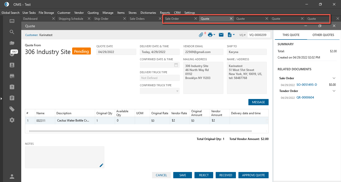 - If on the panel the user selected “Rate Quote” / “Available Order” actions and Vendor -> “Save & Create Quote” / “Send for Quote” buttons are displayed and clickable: