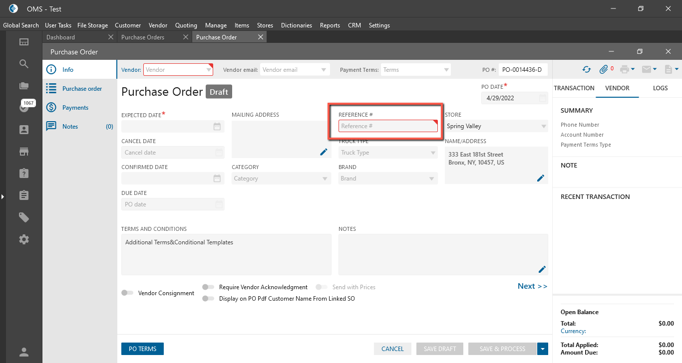 - On the Purchase Order edit form -> “Reference #” textbox is required and the validation is displayed.