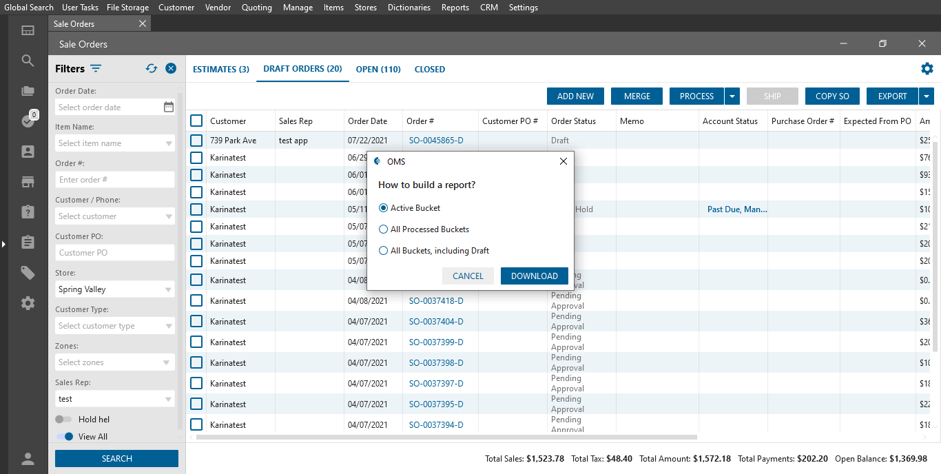- All Buckets, including Draft -> Draft Orders, Open and Closed buckets;
