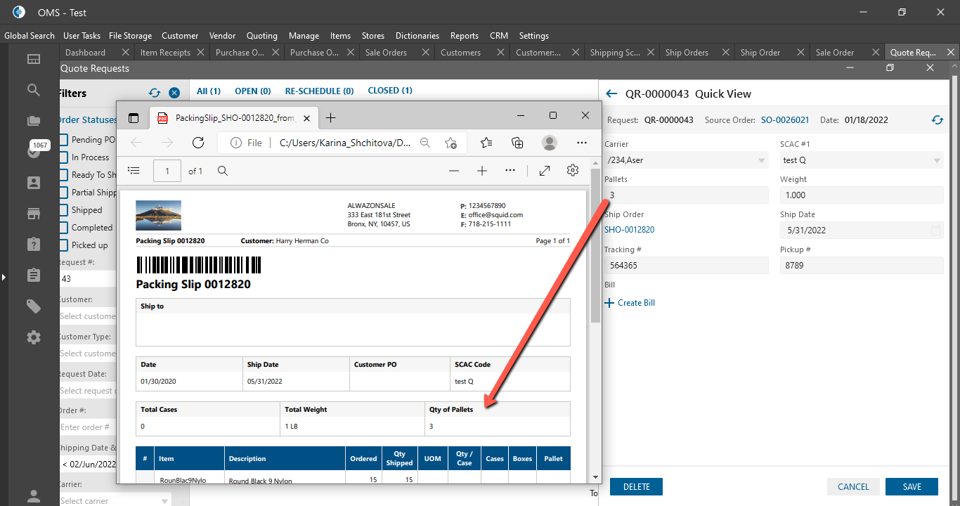 - On the “Packing Slip” PDF is displayed “Qty per pallets” column: