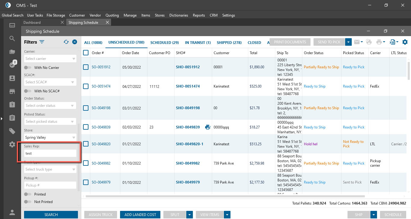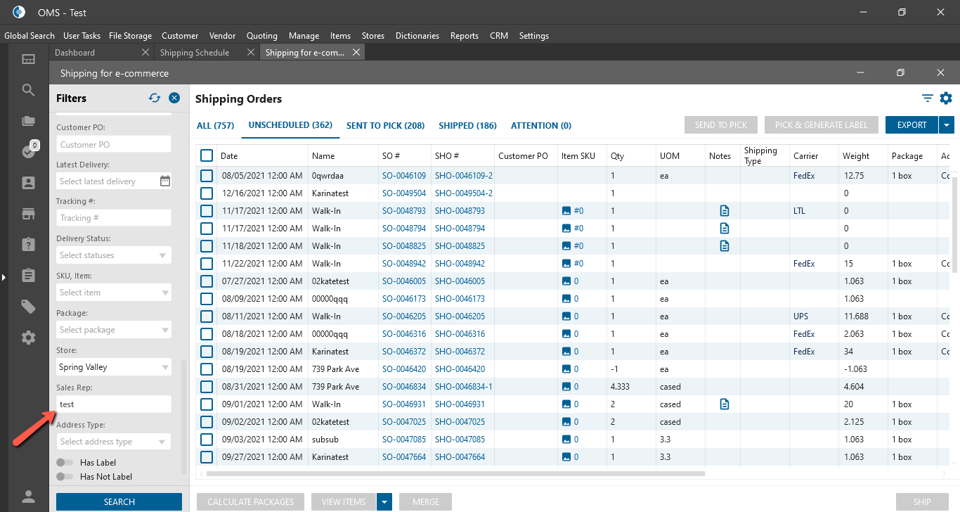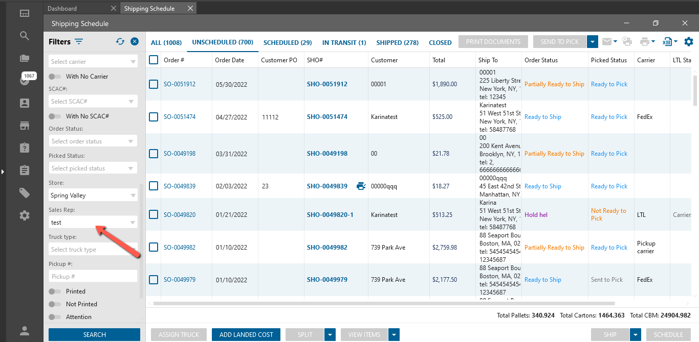 - on the Shipping Schedule / Shipping for E-commerce list forms on the filter panel is automatically filled Sales Rep in the “Sales Rep” dropdown and is disabled the ability to change Sales Rep;