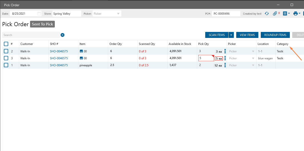 Pick Order edit form: