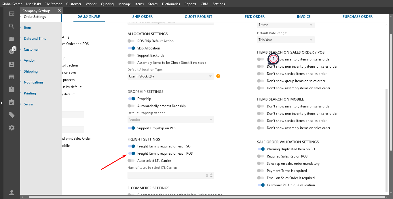 - Open Company settings -> Sale Order tab -> Turn ON “Freight item is required on each POS“;