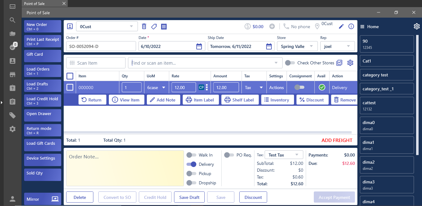 - Create POS -> add item -> set as “Delivery” ->save Draft;