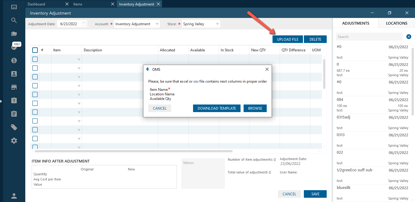 - the OMS pop-up us opened with Info, what columns should contain uploaded File: