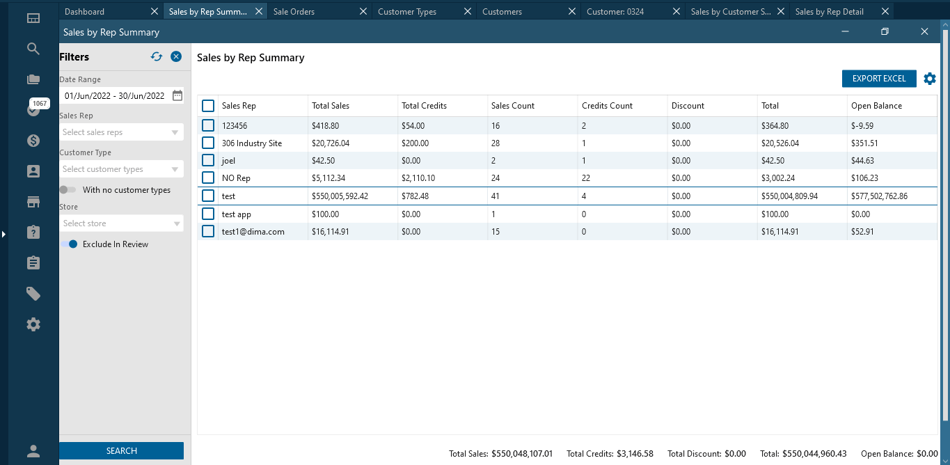 - Total Credits -> is displayed sum of credits amounts by Sales Rep based on the date;