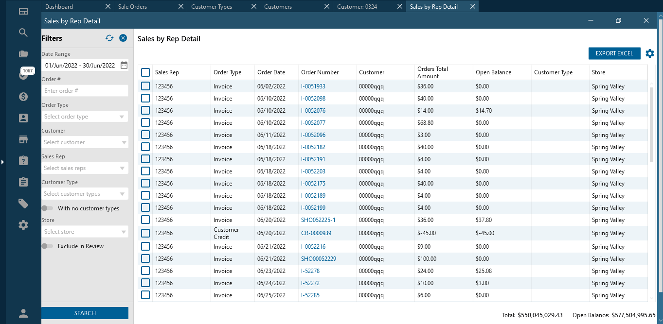 - Total of Sales -> is displayed sum of sales amounts by Sales Rep based on the date;