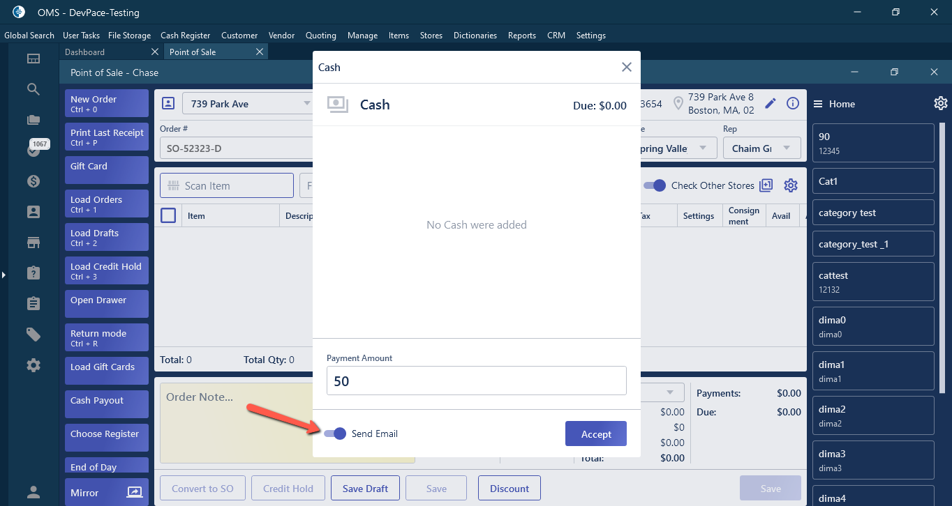 If “Send Email” checkbox is checked on the POS “Payment” pop-up -> the “Send Email” form with linked Payment Receipt is opened.