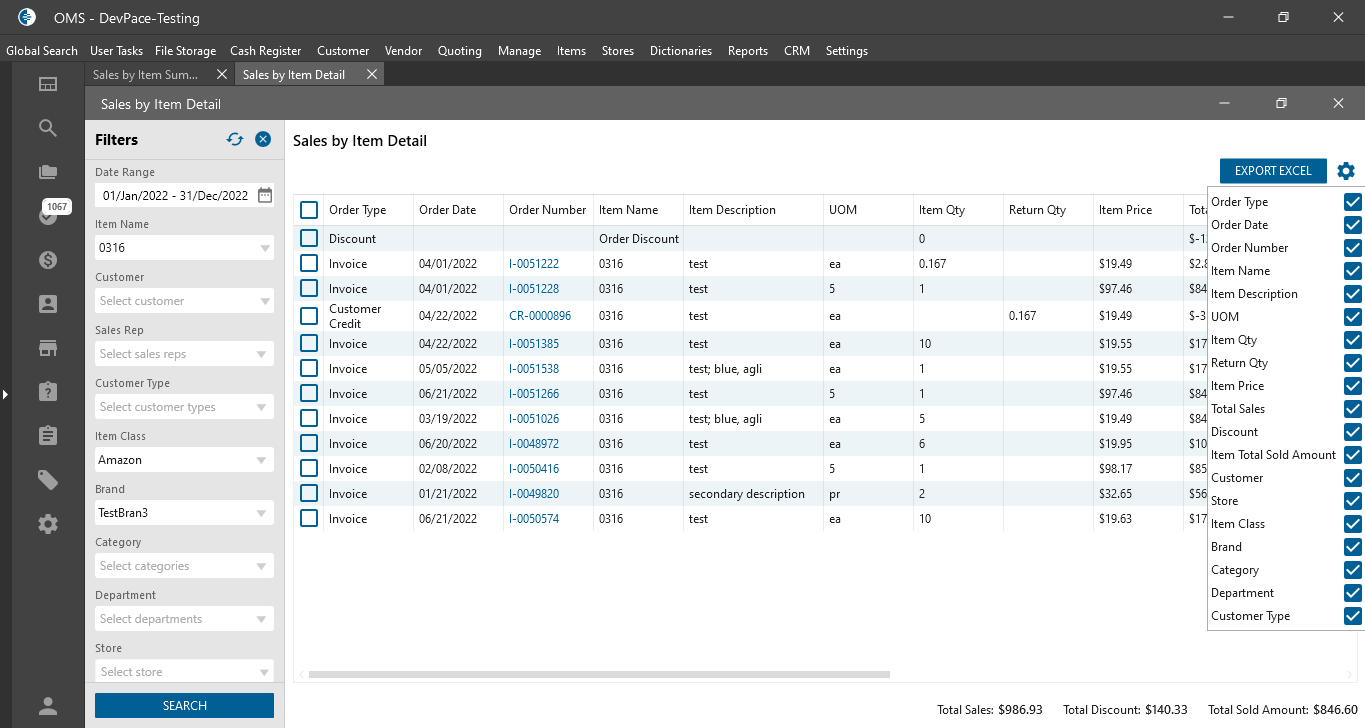 - After double click on the item row -> the “Sales by Item Detail” Report is opened;