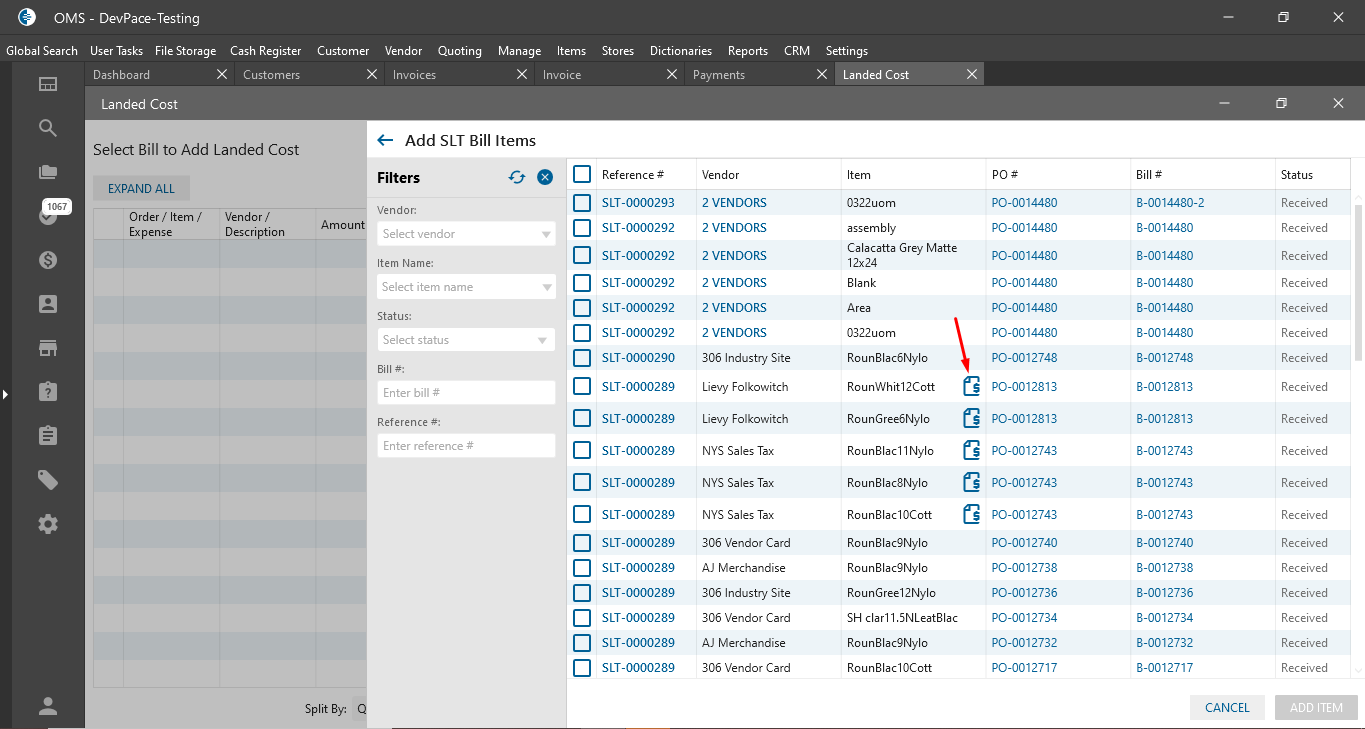 - If for Order types in the list previously was added Landed Cost -> In the Item column: