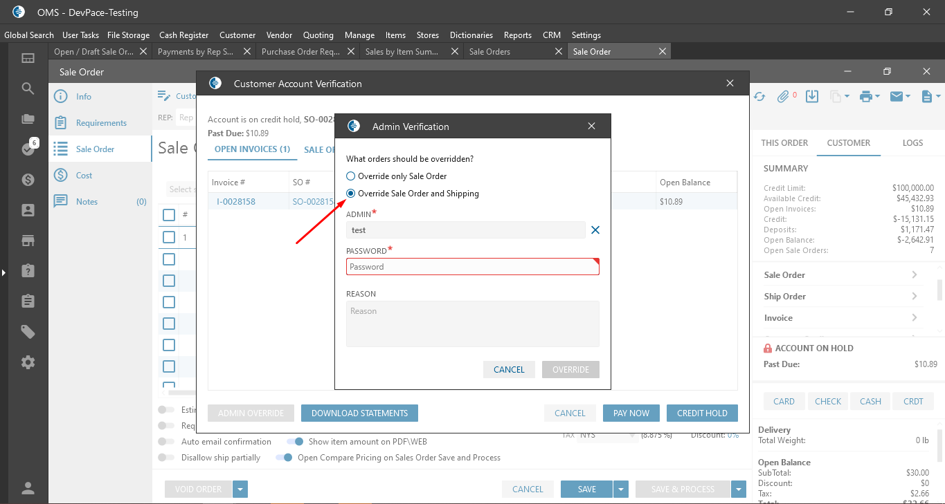 - On the Sale Order edit form -> On the Admin Verification pop-up, the “Override SO & Shipping” checkbox is checked.